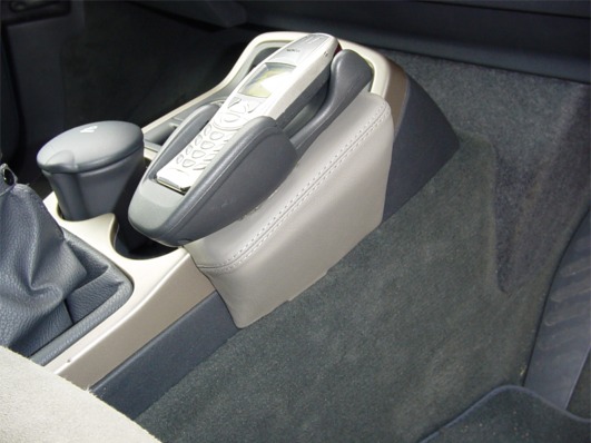 centre console near cup holder. Insert into corner and bend up bottom tag.