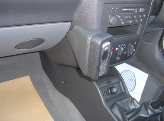 Place console over side of centre console and fix through steel tag into glove